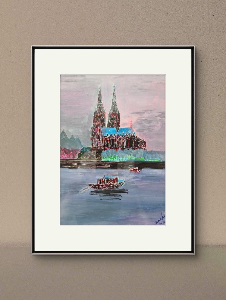 Kölner Dom. Mit Barkasse (Acryl auf Papier, gerahmt 30x40cm, 2024)
