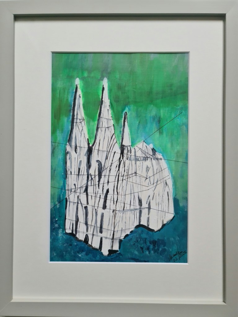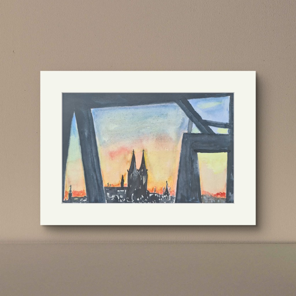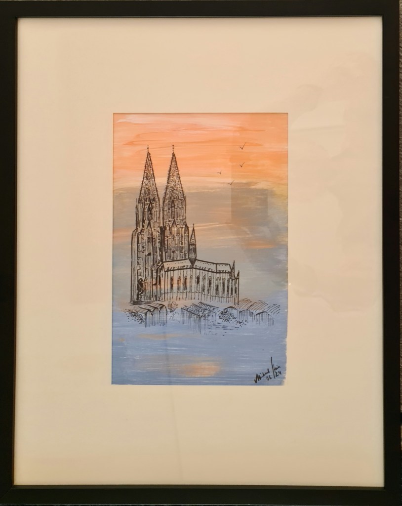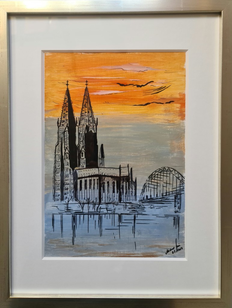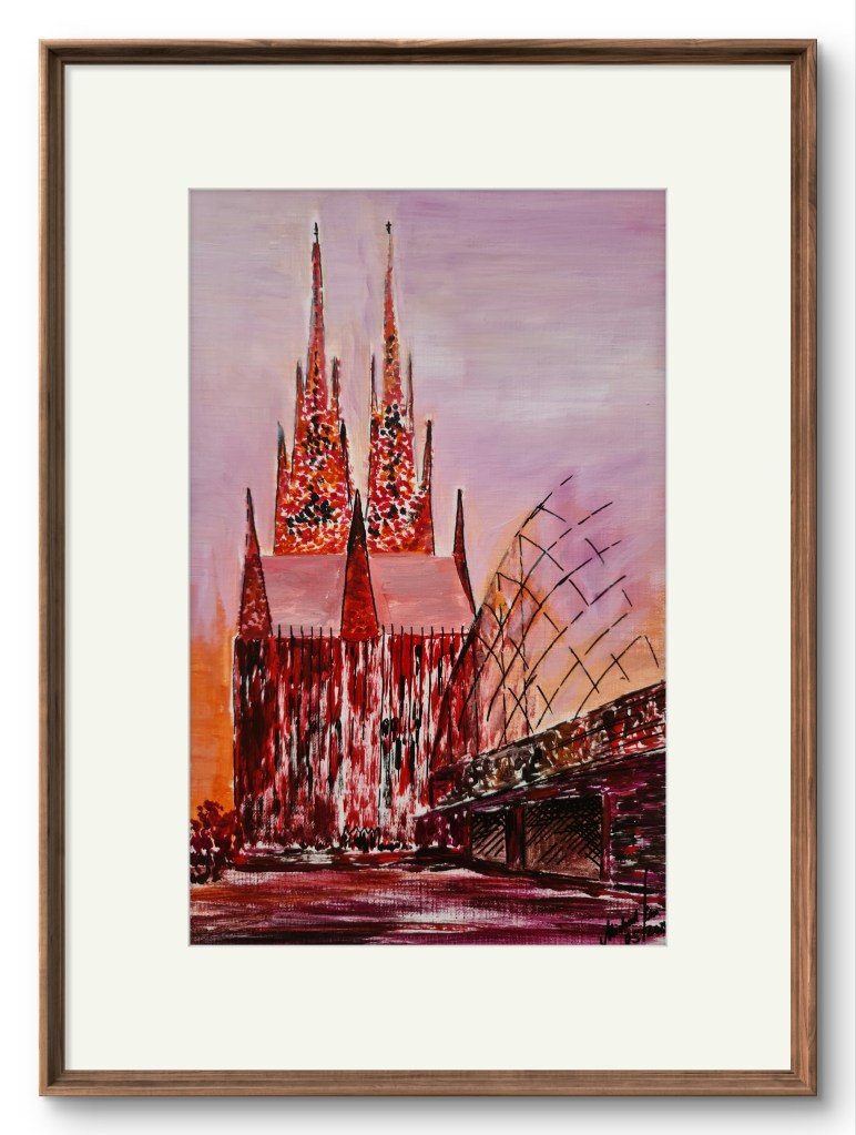 Kölner Dom. Und seine zwei Augen (Acryl auf Papier, 20x30cm, gerahmt 30x40cm, 2025)