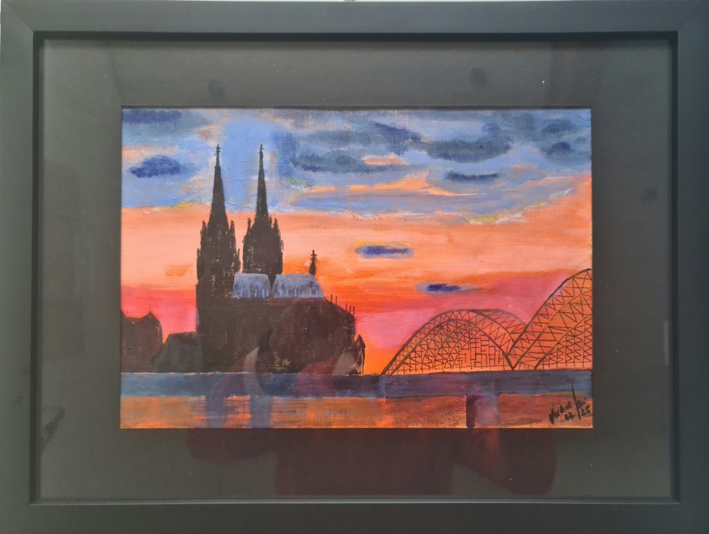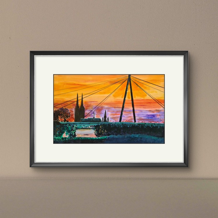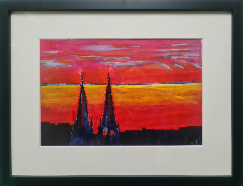 Kölner Dom. Abendrot (Acryl auf Papier, 20x30cm, gerahmt 30x40cm, 2022, verkauft)