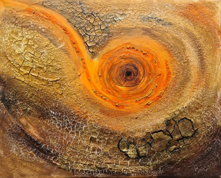Nicht nur die belebte, sondern auch die unbelebte Natur unterliegt einem ständigem Wandel, dem Kreislauf des Werdens und Vergehens. Wasser und Hitze, Kälte und Wind gestalten die Erde von außen. Aufgebrochene Erdschichten, Sandformationen, Wasserstrudel, Felsspalten und dazwischen zarte Pflänzchen sind sichtbare Spuren. Im Inneren der Erde regieren unvorstellbare Kräfte wie Druck und Hitze: Glutflüssige Lava, die Gesteine zum Leuchten bringt und beim Erstarren bizarre Formen hinterlässt. Sonne und Mond sind beständige Zeugen des immer wiederkehrenden Wandels. Die Erde liefert Farben und Strukturen, die Reales abstrakt erscheinen lassen. Ich versuche, anders als hochauflösende Satellitenbilder, frei assoziierend dreidimensionale Momentaufnahmen des Wandels festzuhalten. Was bleibt sind die Farben.