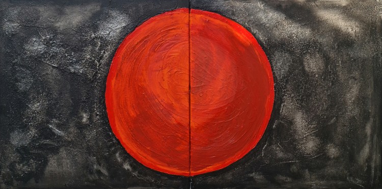Geteilter Blutmond (Mischtechnik auf Leinwand, 140x70cm, 2023)