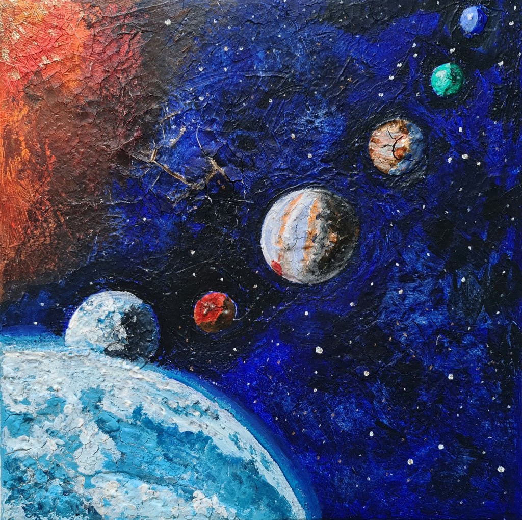 Sonne, Mond und Sterne (Mischtechnik auf Leinwand, 30x30cm, 2023)
