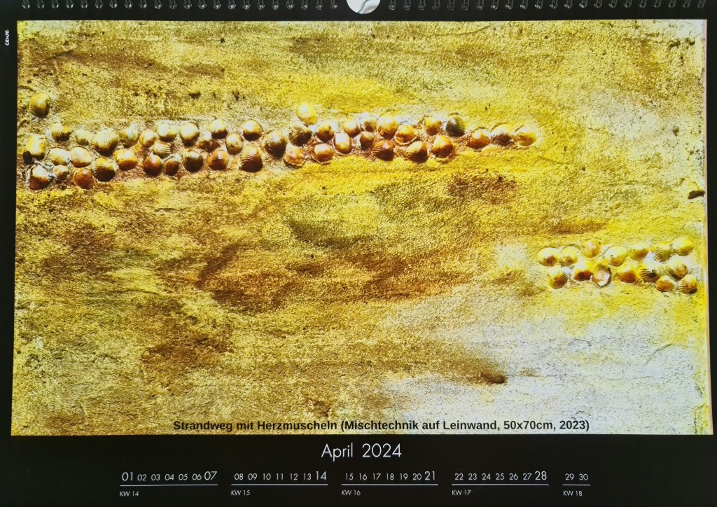 April: Strandweg mit Herzmuscheln (Mischtechnik auf Leinwand, 50x70cm, 2023)