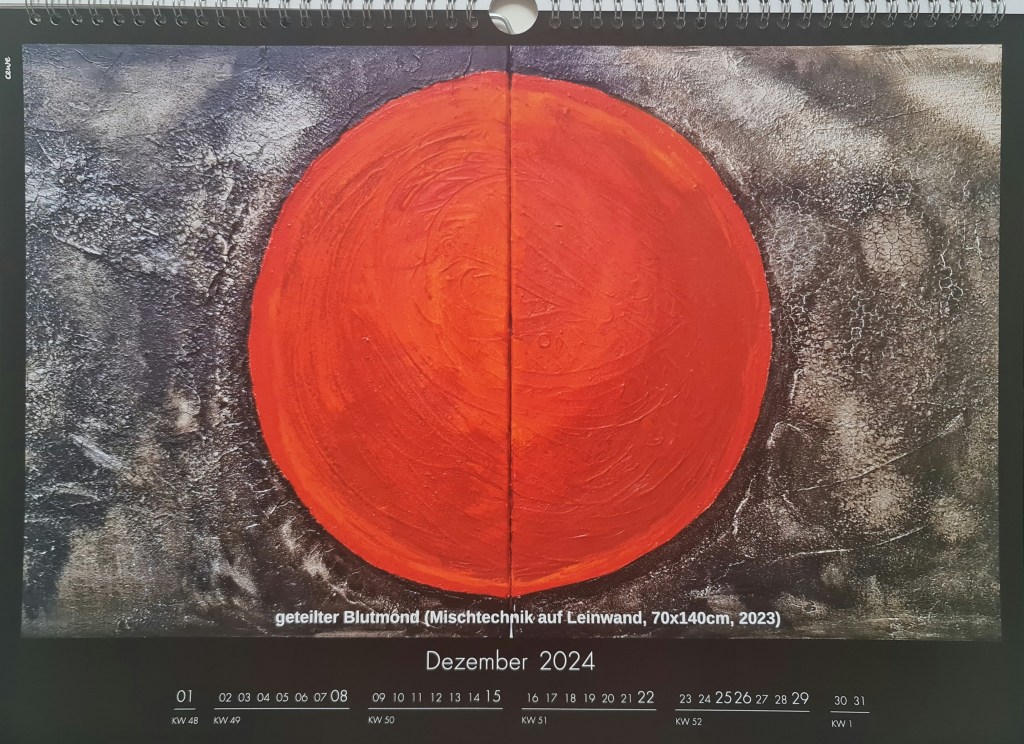 Dezember: Geteilter Blutmond (Mischtechnik auf Leinwand, 70x140cm, 2023)